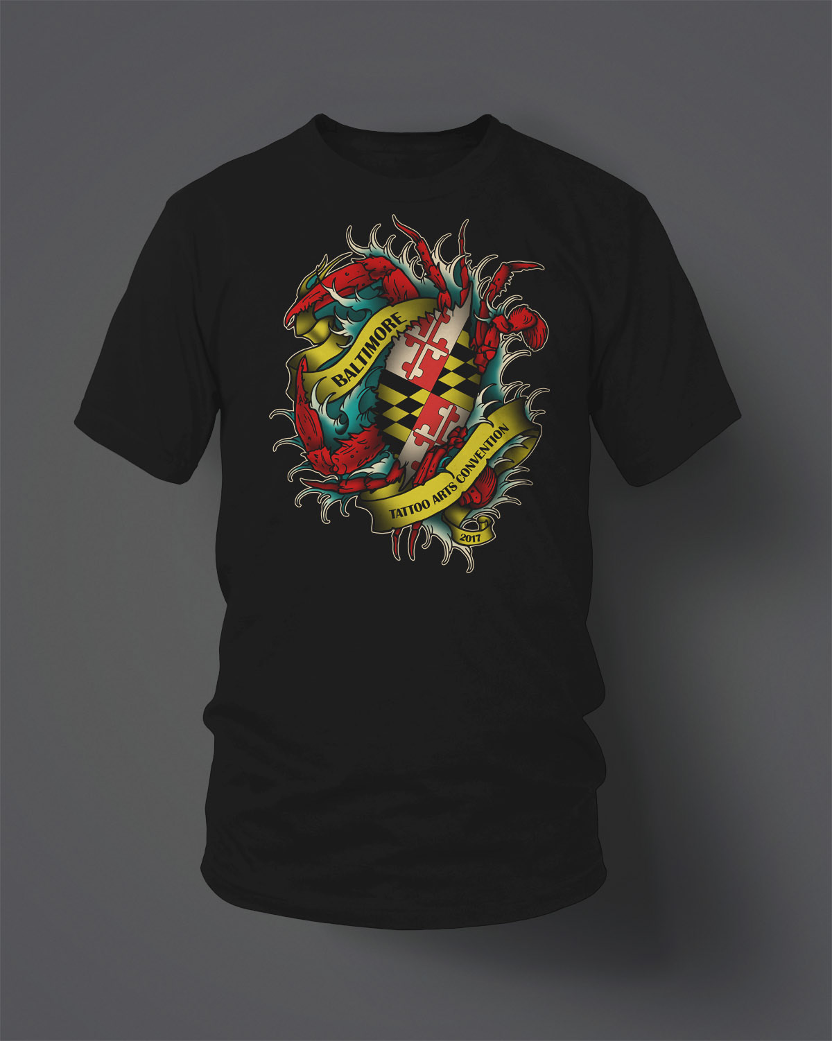 This is an illustration for the Baltimore tattoo arts convention. The artist would supplies me with a line drawing which I scan in. Then adjust it in Photoshop. After this, I bring the artwork into illustrator to create a vector and make further adjustments. After that is complete, I re-open it on Photoshop to color it using different opacity, flows, and brushes to reach the final product.
